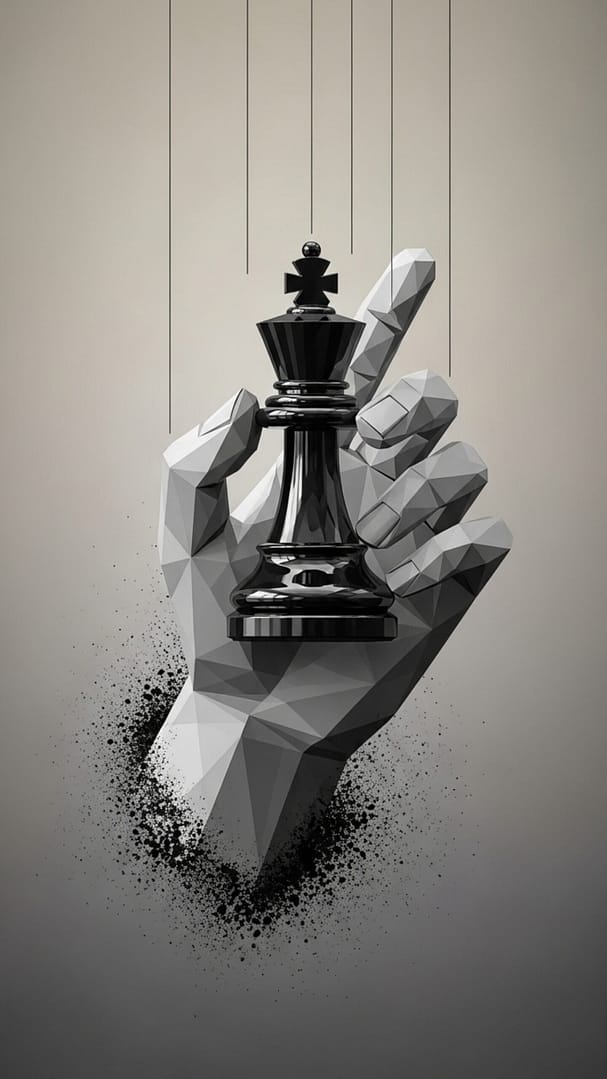 A striking, vertical mobile wallpaper featuring a low-poly, futuristic-looking hand holding a classic black chess king. This minimalist and modern design is perfect for those who appreciate strategy, power, and the intersection of art and technology. Download this high-resolution image for a unique and thoughtful phone background