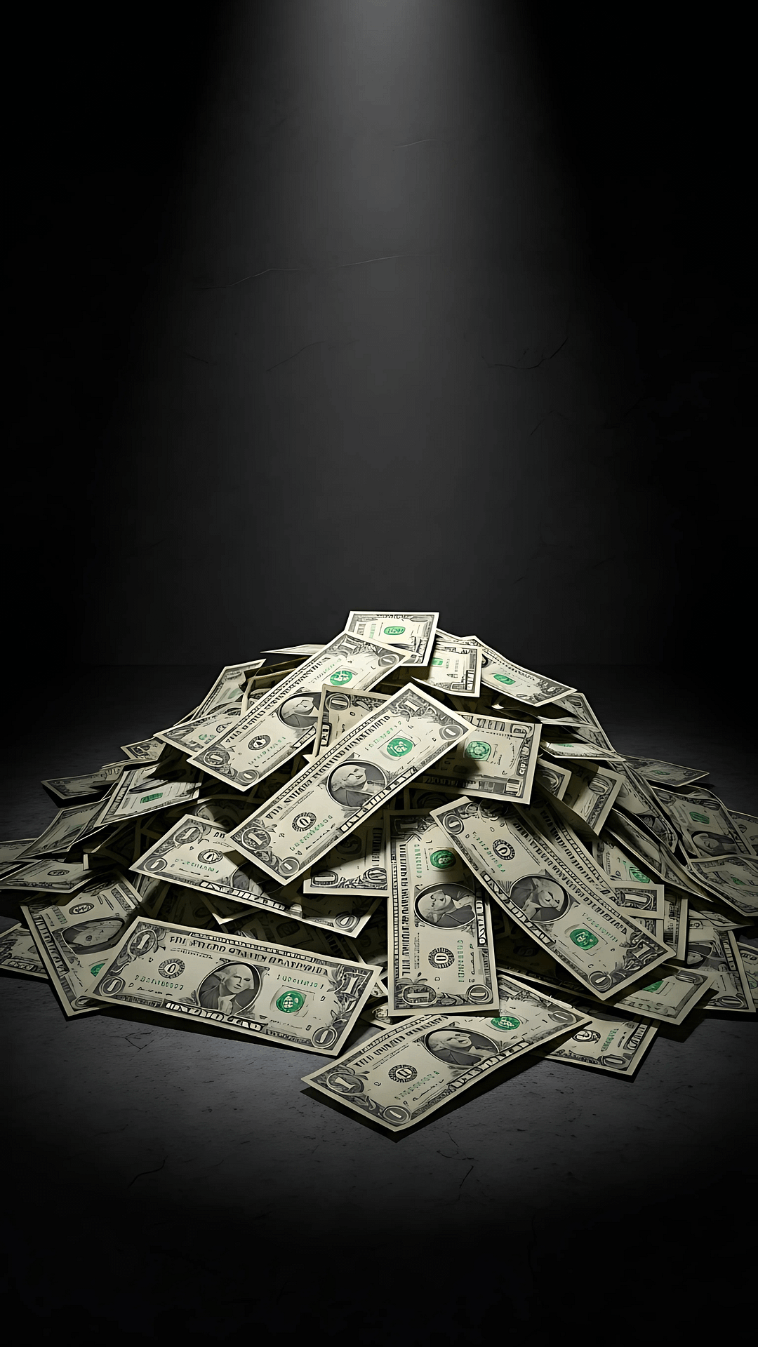 Download a dramatic mobile wallpaper of dollar bills under a spotlight. A high-contrast cash pile image symbolizing wealth, money, and financial abundance. Free in HD, dollar wallpaper for mobile.