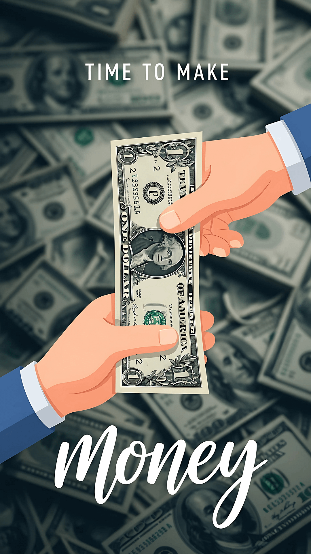Download this bold, vertical wallpaper featuring “Time to Make Money” text with cartoon hands holding a dollar bill. Motivational and perfect for hustlers in HD.