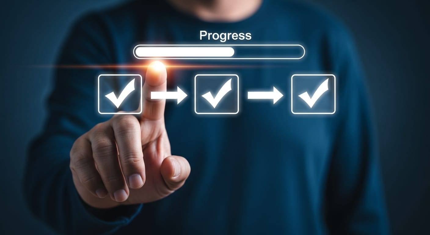 A powerful, conceptual image showing a hand tapping a glowing checklist with a “Progress” bar above it. This royalty-free image is perfect for illustrating concepts of goal setting, project management, and personal development., progress images free Use this high-quality visual for your blog posts, presentations, and websites to inspire progress and achievement.